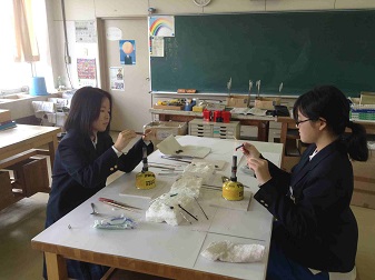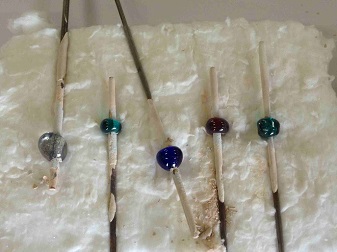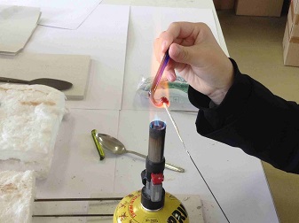 色のついたガラスを溶かし、柔らかくなったところを棒状の金属に巻きつけて形を作るのですが、巻きつけるタイミングが難しそうでした。