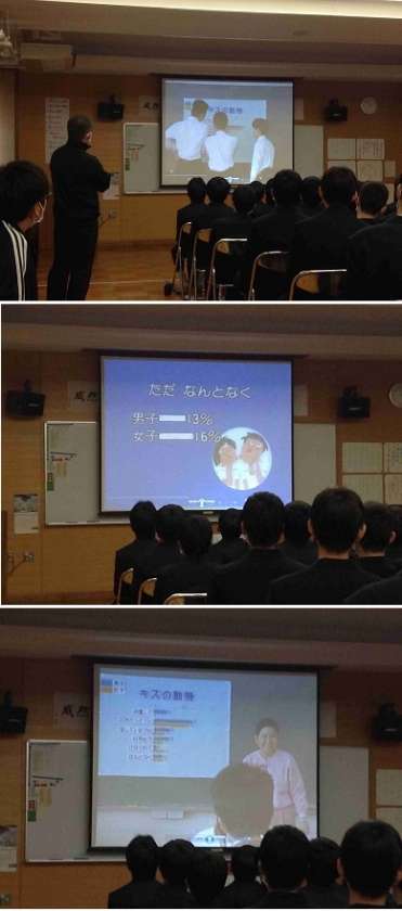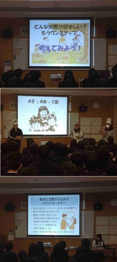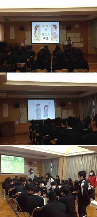 今日は養護教教諭から、異性との交際について、ビデオ・パワーポイントや先生によるロールプレイも交えてさまざまな問題を投げかけました。
