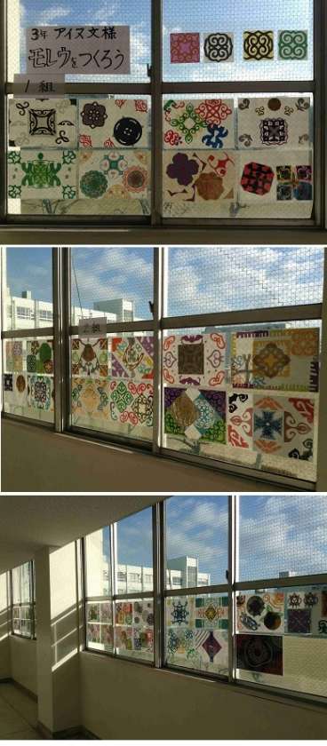 また、美術室前の廊下には3年生の作品(アイヌの文様)が掲示されています。