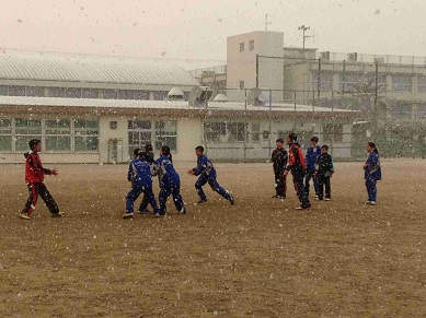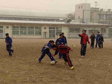 放課後、運動場でラグビー部が活動していると、急に雪が降ってきました。