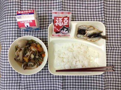 本日の給食は節分の行事献立で、いわしのしょうがじょうゆかけ、含め煮、いり大豆でした。