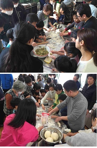 さまざまな国にルーツのある各校参加者が自己紹介した後、子ども達は韓国やフィリピンの遊びで交流を深め、保護者・教職員は調理活動です。