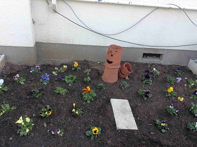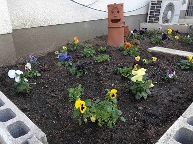 玄関入り口に管理作業員さんがパンジーの花を植えてくれました。