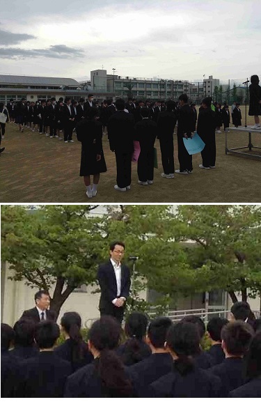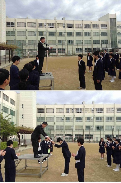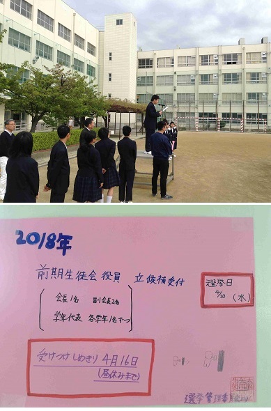 ・次に、前期生徒会役員選挙の公示が行われました。学校や生徒みんなのために活動することは大変ですが、きっと将来自分に返ってくるものがあると思います。期待しています!