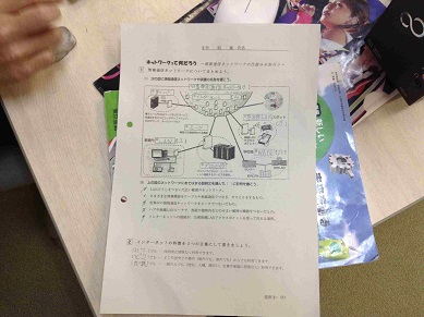 2年生がパソコン教室で、情報の学習をしています。「コンピューターと情報通信ネットワーク」について、パソコンとプリントを使ってネットワークの仕組みや流れを学んでいました。