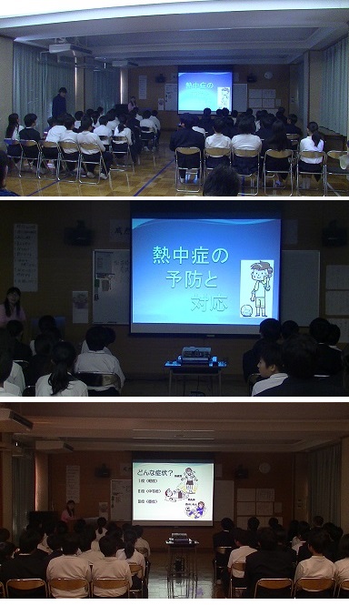 1年生は多目的室で、養護教諭の先生から、パワーボイントを使い、熱中症について、さまざまな条件・体調・環境などに左右されることや、その症状や予防・対処法についても学習しました。