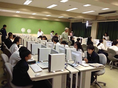 パソコンの初めての授業で、保存や文字の編集方法を説明し、技術科のファイルの表紙を作成しています。
