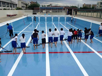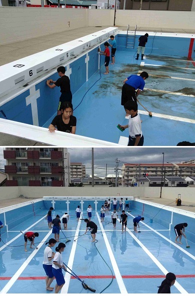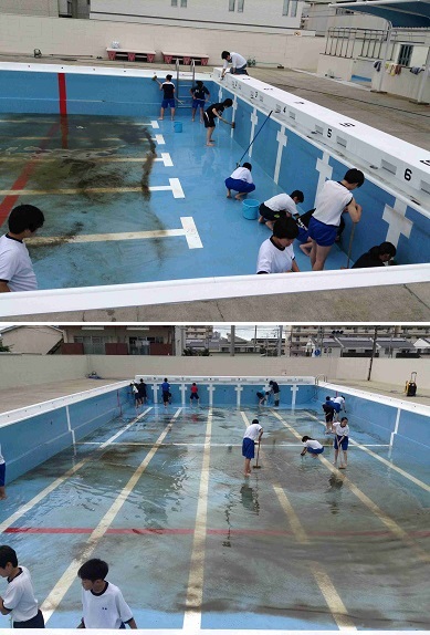 ・プールの季節がやってきました。水泳の授業に備えて、プールの清掃がおこなわれました。