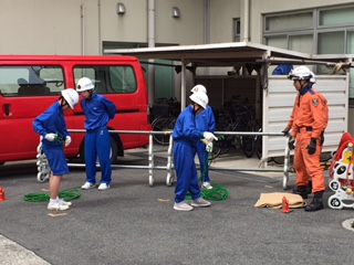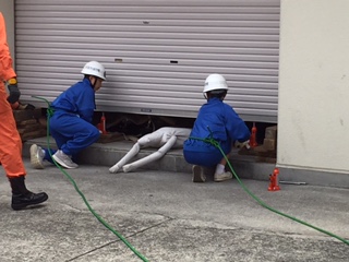シャッターに挟まれ動けない人をジャッキで救出する訓練を受けていました。