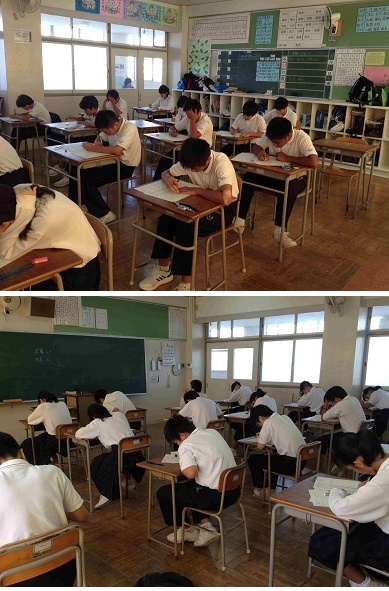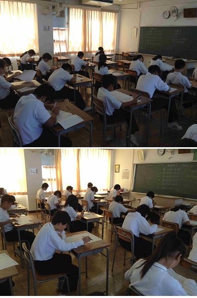 ・本日、3年生では実力テスト、1・2年生では課題テストが行われました。夏休みに勉強してきた成果を発揮するべく、みんな集中してテストに取り組んでいました。