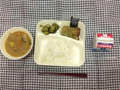 ・本日の給食は、お好み焼き・豚汁・きゅうりの梅風味でした。