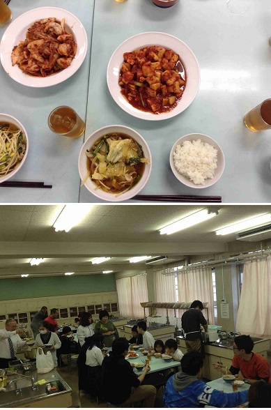 小・中学校のチョソン友の会の児童・生徒と民族講師の先生や学校の先生も一緒にもつ鍋をつくり、キムチやコーン茶と一緒においしくいただきました。