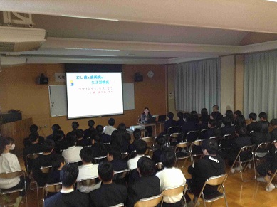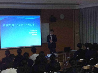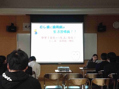 養護教諭や歯科校医の先生からは、パワーポイントを使い、むし歯や歯周病の他、歯と健康についてお話がありました。 日頃からしている歯磨きですが、今日の話を聞いて、生徒にもいろいろな「気づき」があったようです。