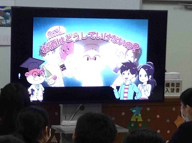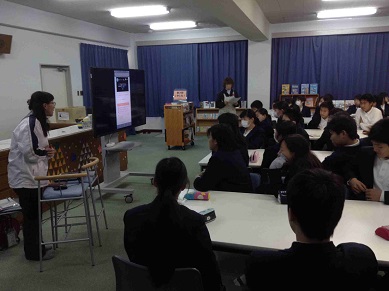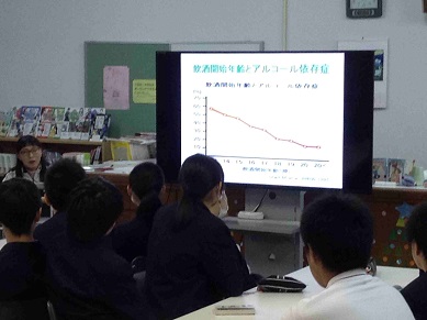 図書室で養護教諭からパワーボイント使用し、飲酒が体におよぼす影響や害について学びました。