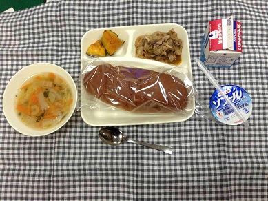 2学期最後の給食です。明日が冬至なので、献立には「かぼちゃ」が入っています。