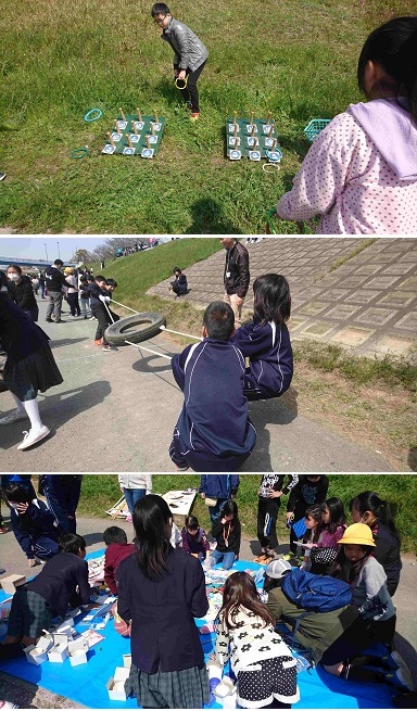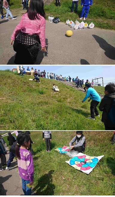 矢田地域の取り組みの一つで、大和川の土手で子どもたちが集まり、ゲームをしたりして遊びます。