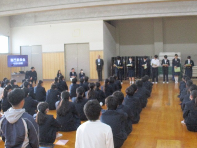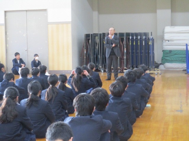 「先週、1年生は職場訪問、2年生は校外学習を無事終えましたね。この体験を、1年生は来年度の職場体験、2年生は修学旅行に是非つなげていきましょう。