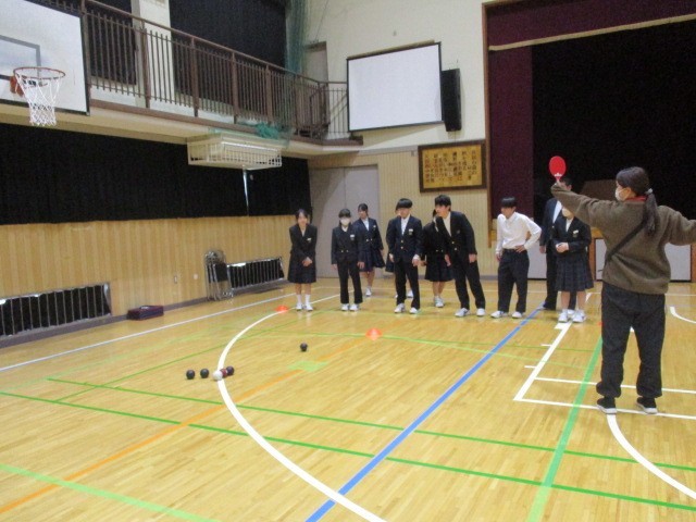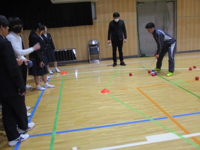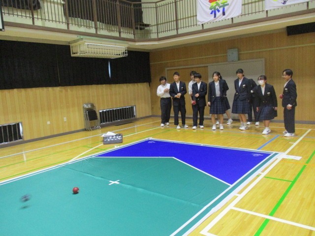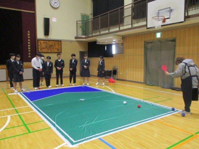 本日、2年生が総合的な学習の時間に、ボッチャ体験を行いました。