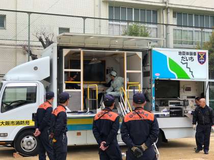 そして、何と言っても、本日の目玉は大阪市に2台しか無い起震車が来て、震度5〜7クラスの地震の揺れを体験することができたことです。