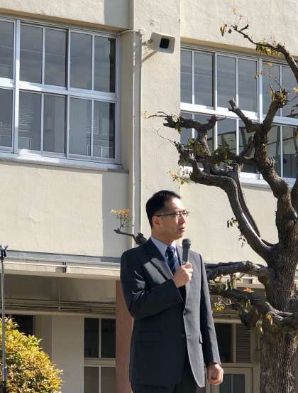 「今日は挨拶について話をしたいと思います。挨拶は相手へのプレゼントです。元気に挨拶をされると、挨拶をされた人は良い気持ちになります。心を開いてしっかり挨拶してほしいです。特に学校には色々な方が来られます。皆さんが爽やかに挨拶をできれば、そのような方々に気持ちの良い学校だと思っていただくことができ、気持ちよく帰っていただくことができます。