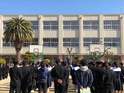 朝、女子バレーボール部の人たちが正門付近で登校してくる人に挨拶をしてくれていますが、素晴らしいことです。一人一人が自覚を持って挨拶できるようになってほしいです。」