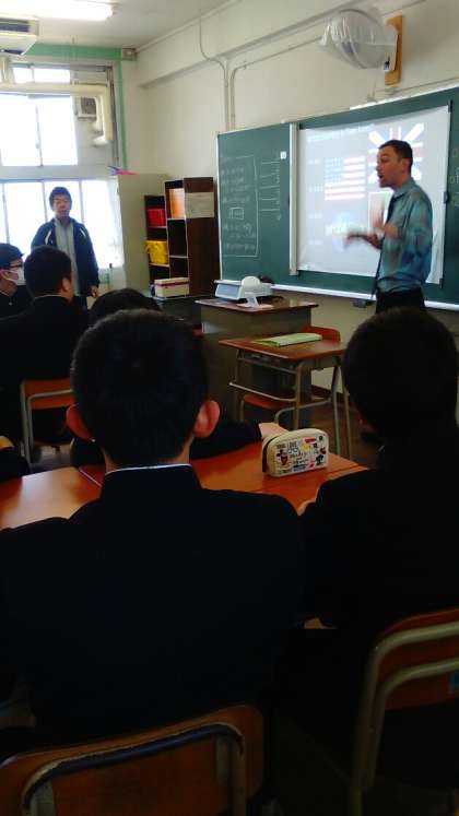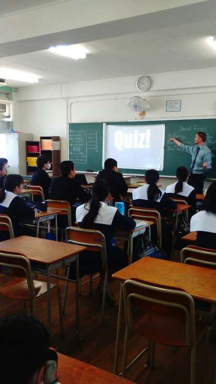 2年生の英語の授業。C-NETのDaniel Fargo先生の自己紹介です。