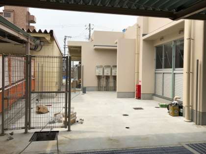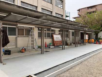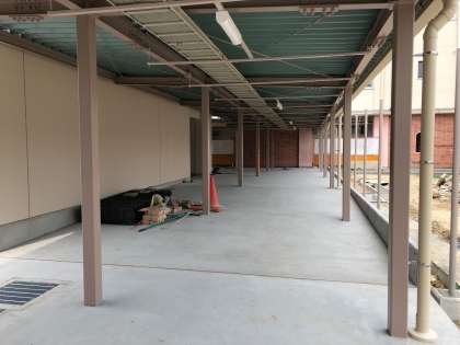 給食調理室の工事ですが、調理室の前の渡り廊下も完成しつつあります。
