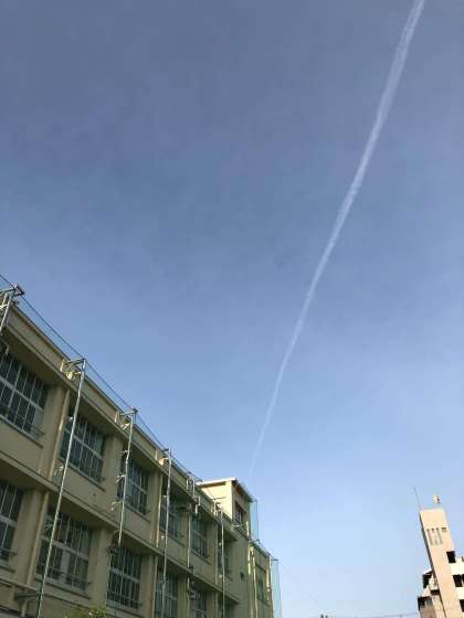 空を見上げると、少し崩れかけていますが、飛行機曇が見えました。