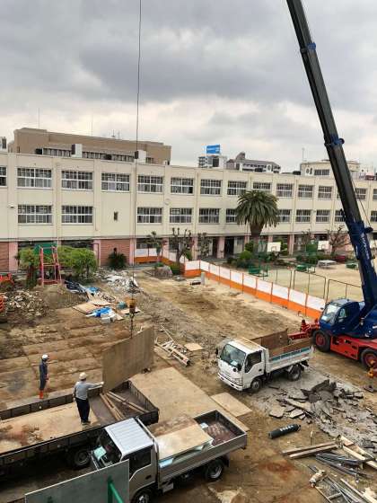 大きなクレーンで重たい鉄板を持ち上げ、トラックに1枚ずつ積んでいる様子です。