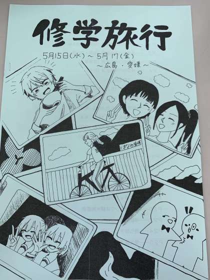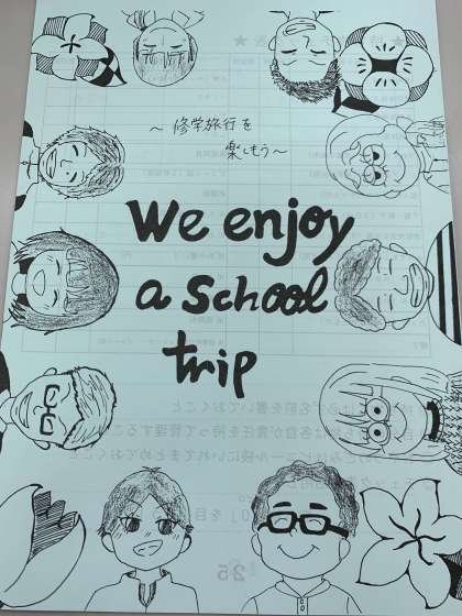 3年生に修学旅行のしおりを本日配布しました。表紙のイラストは美術部のみなさんが書いてくれました。裏表紙には3年生の先生のイラストが描かれています。可愛らしく書いてくれてありがとう。