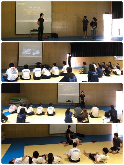 溝清掃では水泳部の人がボランティアとして参加してくれましたが、講習会には柔道部の人が参加し、講師の先生から「見本になってくれる」と声をかけられて、保護者の方の前でトレーニングの仕方の見本となってくれました。