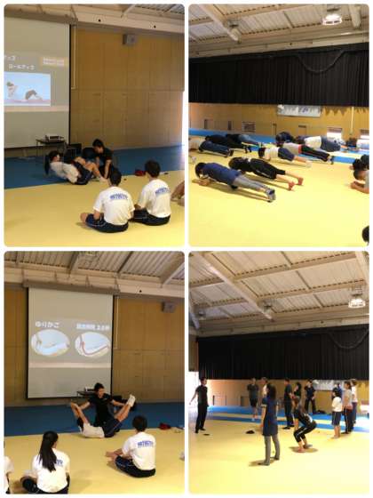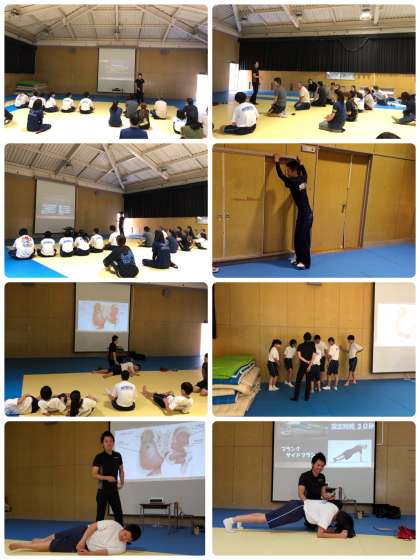 溝清掃の後、「けがをした時の対処法」「体幹トレーニング」「ヒップアップトレーニング」ということをテーマにした講習会をPTA主催で行いました。