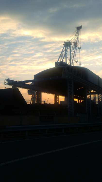 造船所の向こうに夕陽が沈み、夕焼けがきれいです。