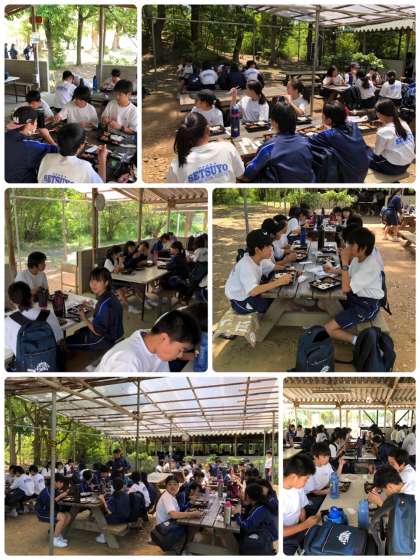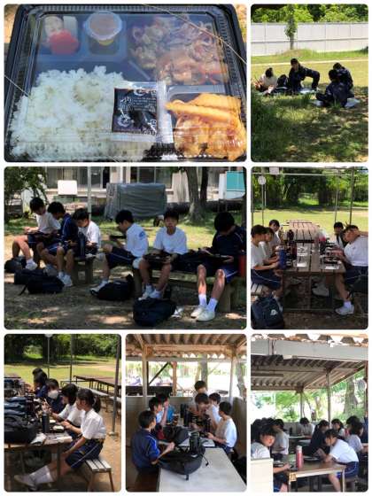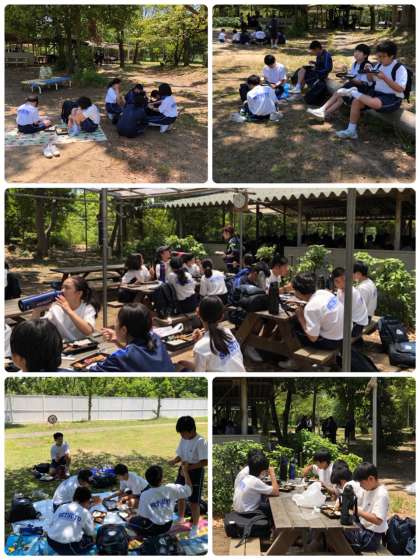 お弁当を食べています。朝ごはんをたくさん食べたので、お腹いっぱいと言ってる人もいましたが、みんな食べていました。