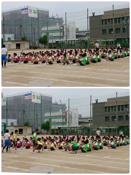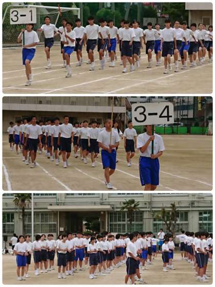 1、2時間目は3年生です。入場行進、開会式に関わる部分の練習をした後、全員リレーについて確認をしています。