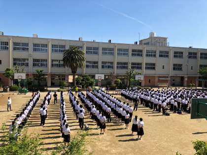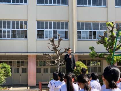 校長先生からは「先ほど賞状を手渡しましたが、昨日、一昨日と大阪市中学校春季総合体育大会がありました。様々な競技が行われましたが、土曜日にハンドボールが3位、柔道は先週行われましたが、こちらも3位と健闘してくれました。秋にも秋季の総合体育大会がありますので、そちらも頑張ってほしいと思います。