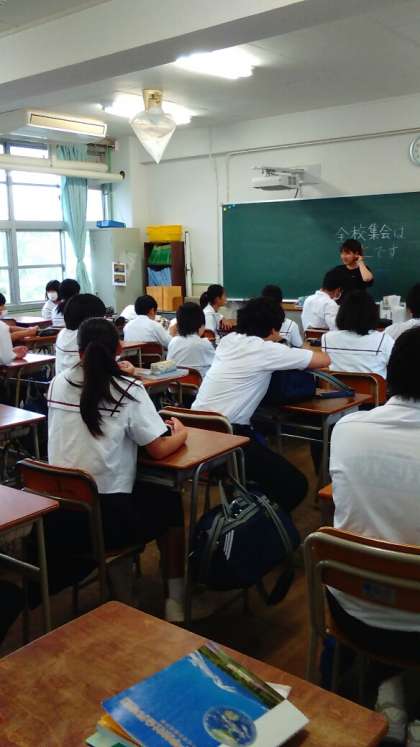 雨のため、全校集会は中止にしました。午後の全体練習ができればいいですが。