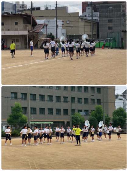 行進を先導する吹奏楽部の人も、グランドを歩きながら演奏の練習です。