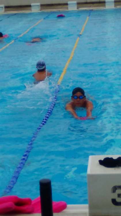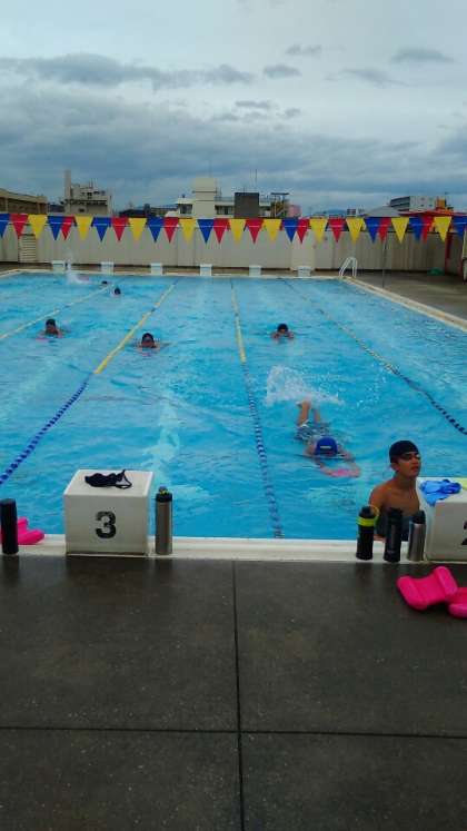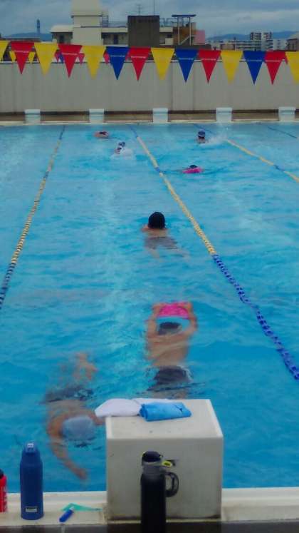 体育館の上、屋上プールで水泳部が練習に励んでいます。