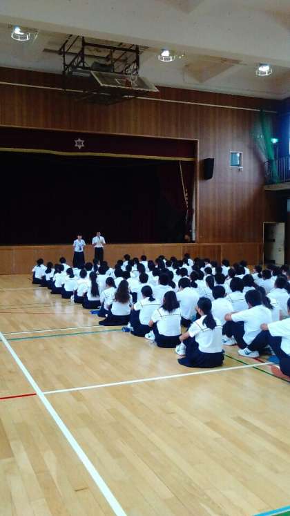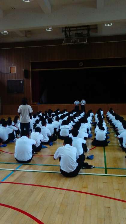 1限、2年生が1学期最後の集会をしています。各クラスの代表が