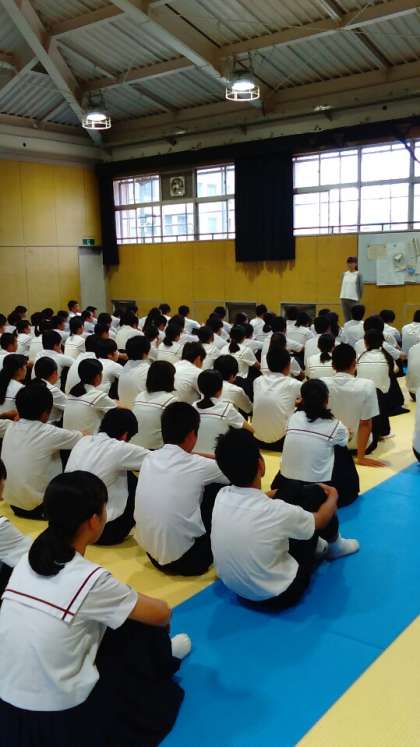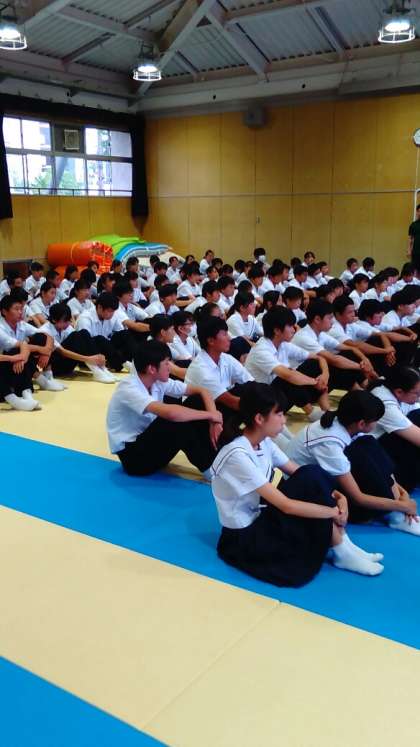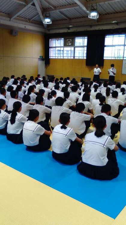 1限、3年生は格技室で集会をしています。クラスの代表からまとめの発表があった後、各先生からお話しがあります。