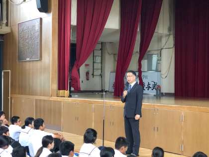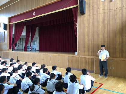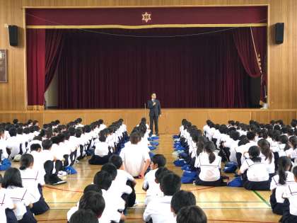 校長先生から「一学期を振り返ってみてどうでしょうか。1年生は良いスタートを切れましたか?一泊移住を通じて協力しながら活動したことが、その後の学校生活に生かされました。2年生は泊行事はありませんでしたが、2学期には職場体験等があります。頑張りましょう。1年生の時よりも一人ひとりの自覚が表れてきています。3年生は最高学年としてみんなを引っ張ってくれました。一緒に修学旅行に行きましたが、守るべきところを守って素晴らしかったです。これから部活動は最後の試合や発表となっていきますが、も悔いの無いようにしてください。全体のことと言えば、体育大会は準備、本番、後片付けに至るまで素晴らしかったです。行進、大縄跳びみんなで協力して頑張りました。2学期の文化発表会に向け、取り組みが始まっていますが、しっかり準備をしましょう。