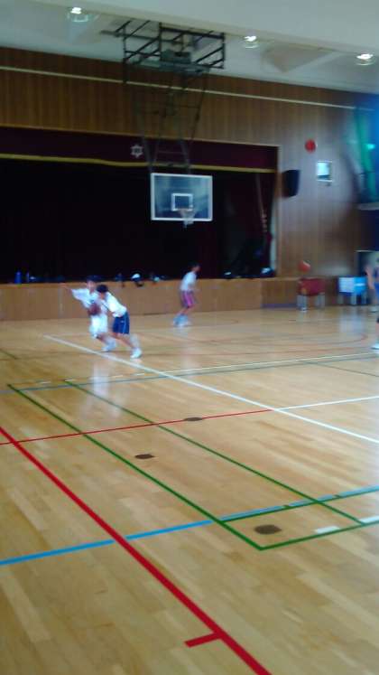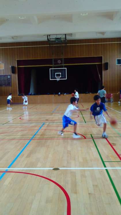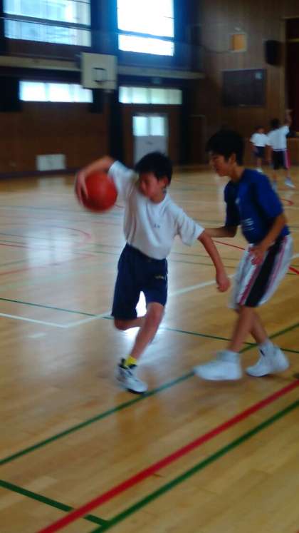体育館では男子バスケット部が練習しています。1対1のスキルアップをめざしています。