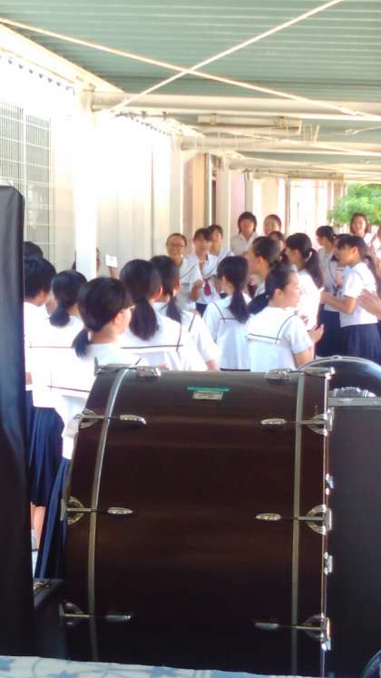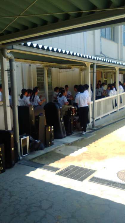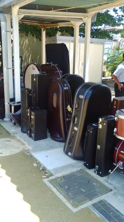 楽器をトラックに積み込むため、待っているところです。演奏する曲に歌詞をつけて歌いながら、手拍子でリズムを確認しています。