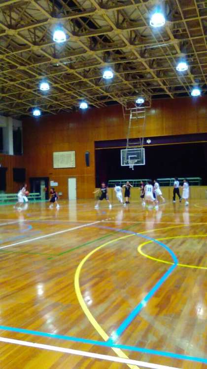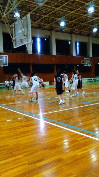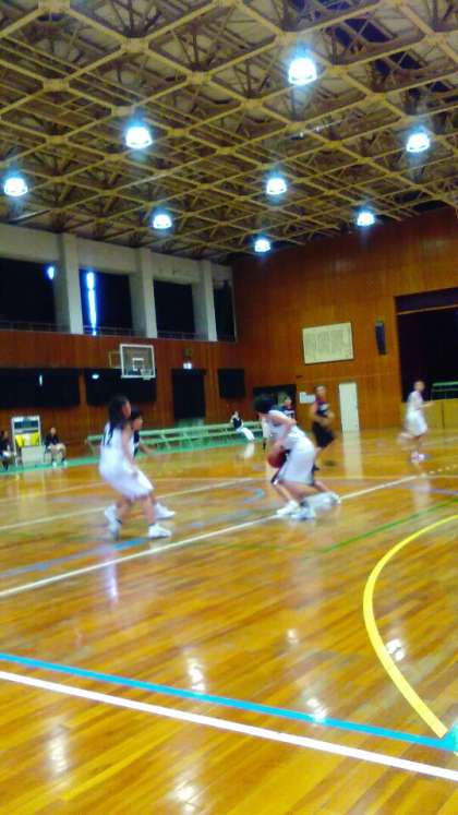 女子バスケット部は6ブロック大会に出場しています。1.2年生だけの試合になります。白のユニフォームが摂陽中学校です。