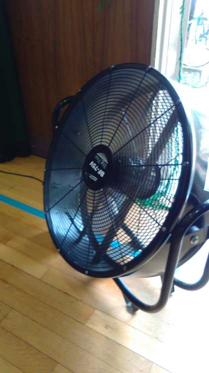 体育館の男女バレー部の練習です。大型扇風機が威力を発揮しています。