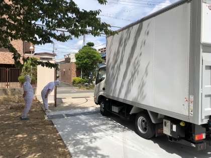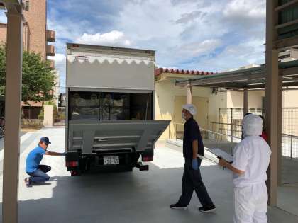 積み込みを完了したトラックが長吉西中学校に出発しました。