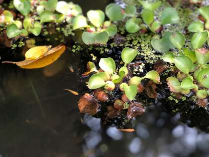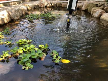 池ではメダカたちが元気に泳いでいます。成魚や生まれてまだ日の浅い稚魚、幼魚など様々な大きさのメダカがいます。