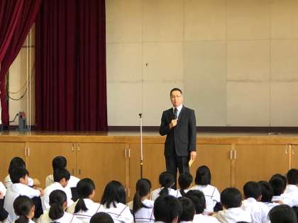 校長先生より「おはようございます。長かった夏休みですが土日を含めて37日、888時間ありました。家族と過ごしたこと、部活動を頑張ったこと色々あったと思います。