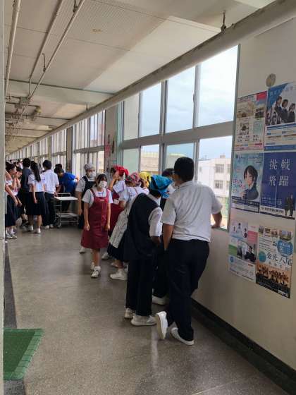 廊下には給食室へ行く当番の人たちがエプロン、三角巾、マスクを着用して並んでいました。